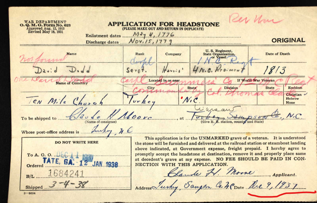 This is Claude Moore’s application for a headstone, dated January 1938.